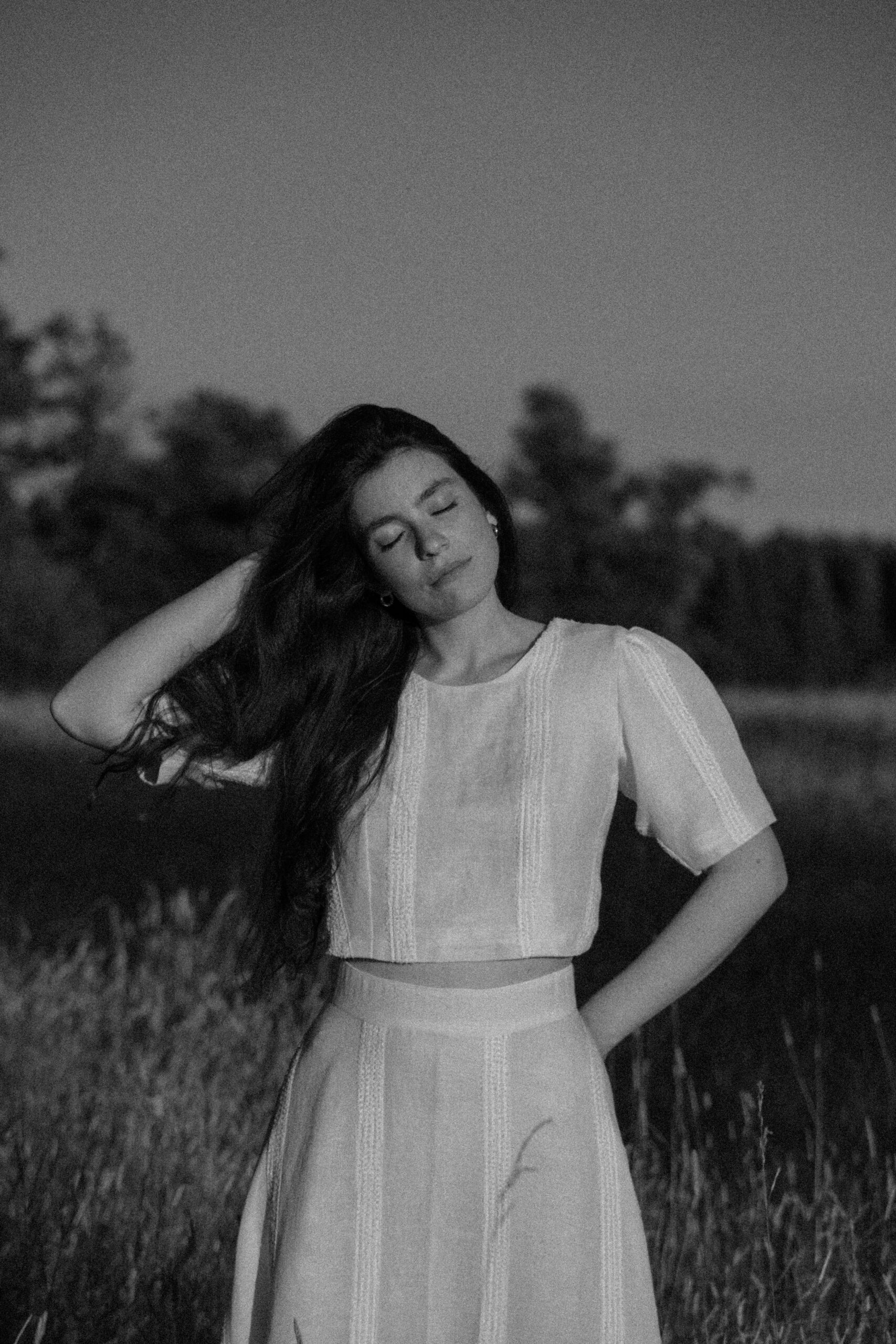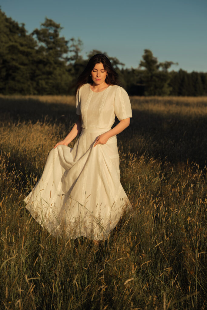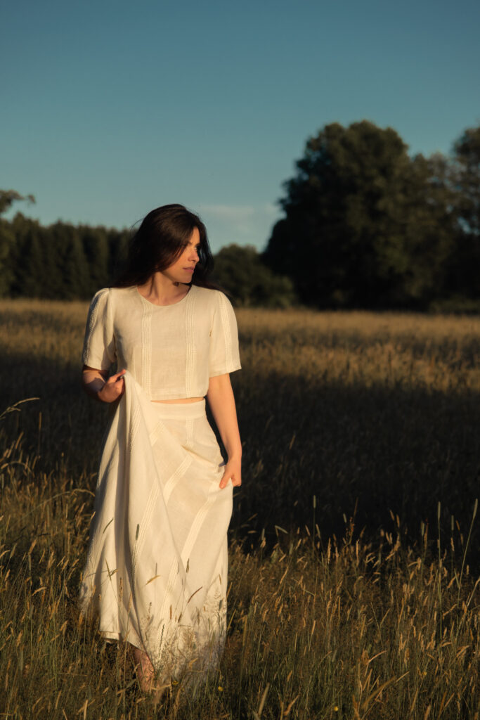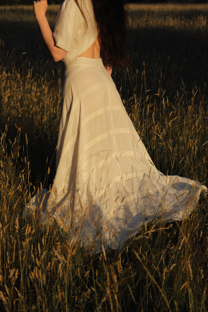 La tenue ‘la bohème’ a une allure très féminine avec sa jupe longue et fluide qui met la taille en valeur.