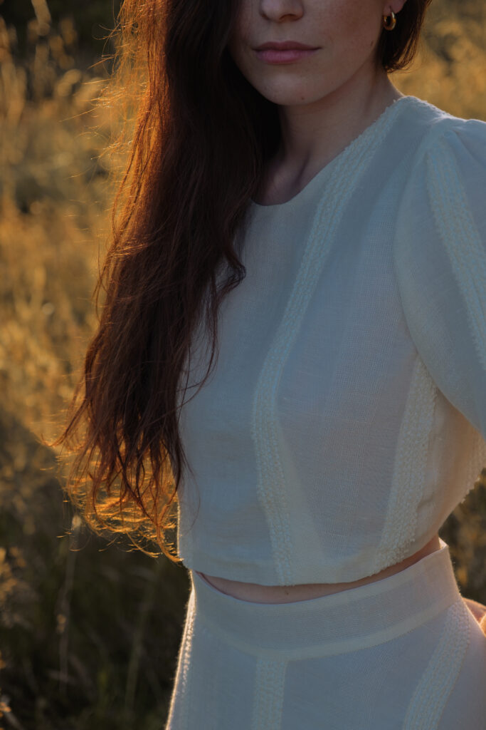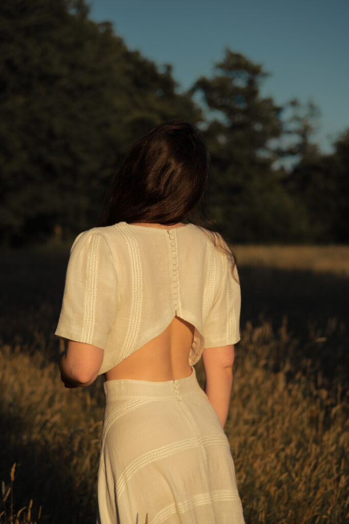Cette jupe se combine avec un dessus romantique avec un dos ouvert par le bas et une fermeture avec des petits boutons par le haut. Les manches courtes donnent un côté fantaisiste, mais ne vous fiez pas aux apparences, cette tenue représente une fleur rare à ne pas sous-estimer.